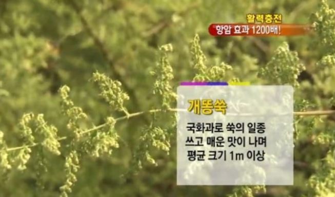 개똥쑥에는 아르테미신과 플라보노이드 성분이 함유되어 있어 강력한 항암작용을 합니다. 특히 아르테미신이라는 물질은 암세포만을 선택적으로 죽이는 능력이 탁월하여 기존 항암제보다 무려 1200배나 강한 효과가 있습니다.